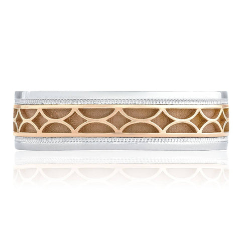 Express yourself! This bold 6mm Gents band with a 18kt Rose Gold reverse venting stripe and 18kt White Gold rim detailing is for the Tacori Man who isn't afraid to show off his colors.