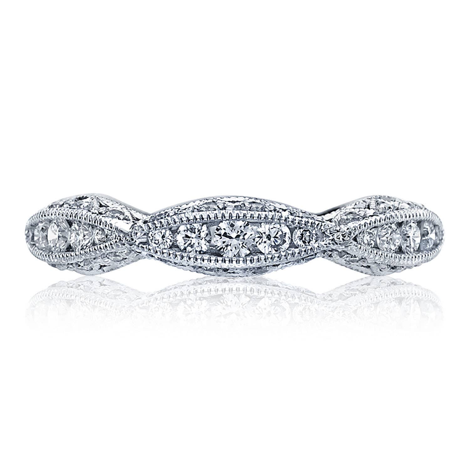 An eternity of defining ribbon-like twists display meticulously set diamond accents from every angle. Windows of light add brilliance to the inner face silhouette, and Classic Crescent fabric lines the interior.
