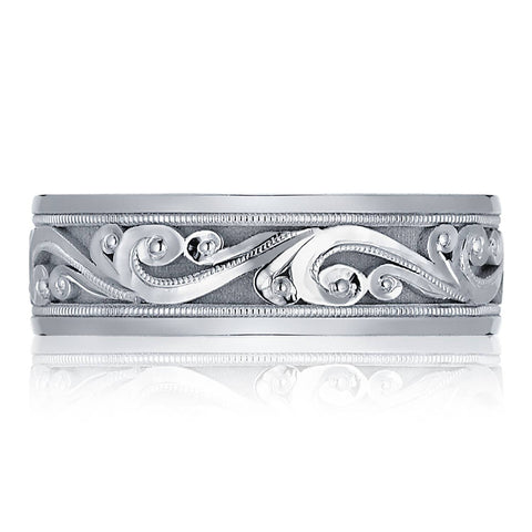 With a unique vented interior, this Tacori band is lighter and more stylish than ever. Features unique hand engraved signature Tacori details decorating this 7mm crescent engraved band.