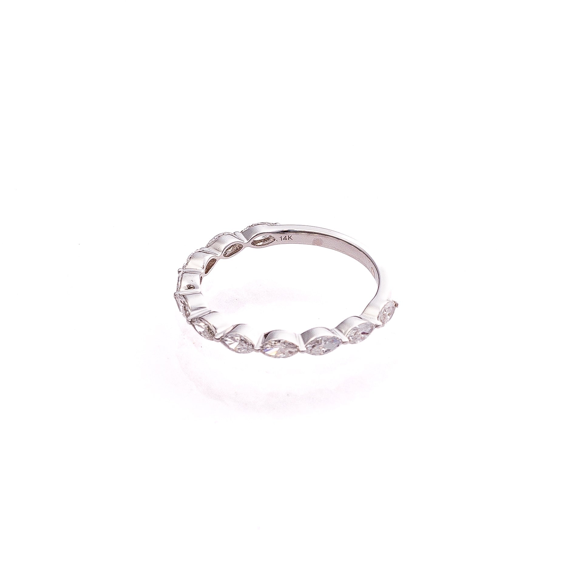 The Marquise East-West 0.66ct Band is a stunning and modern wedding or fashion ring, expertly crafted in 14kt white gold. This elegant band showcases a series of marquise-cut diamonds, totaling 0.66 carats, set in a unique east-west orientation for a contemporary twist. Each diamond, graded G-H in color and VS in clarity, is carefully placed in a sleek prong setting to maximize brilliance and highlight the elongated, graceful shape of the marquise cut. Perfect for those seeking a distinctive yet timeless look, this band is ideal for stacking with other rings or wearing alone as a statement piece. Handcrafted for comfort and durability, it is available in standard ring sizes with customization options for a personalized fit.