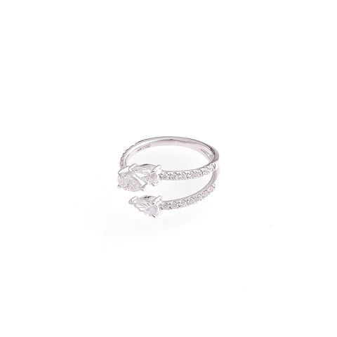 A stunning display of brilliance, this ring showcases three pear-cut diamonds arranged in perfect harmony, creating a bold yet elegant centerpiece. The design is enhanced by a pavé-set diamond band, adding extra sparkle and sophistication. With 24 total diamonds and a combined weight of 2.57 carats, this piece is beautifully crafted in luminous 14K white gold-an eye-catching symbol of style and romance.