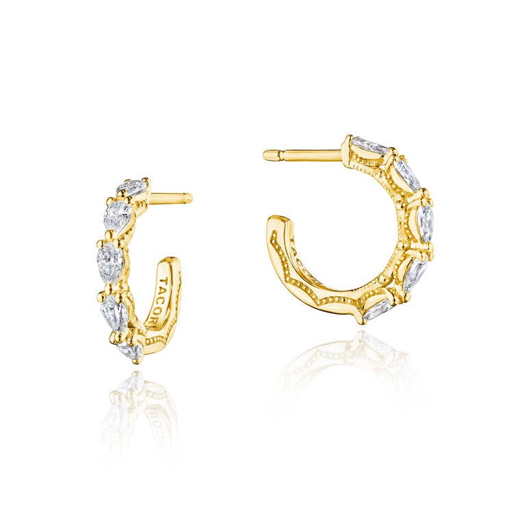 Delicate small hoop earrings of 18k Yellow Gold are meticulously hand-set with pear-cut diamonds. Milgrain-studded TACORI Crescent detailing decorates the silhouette.