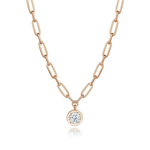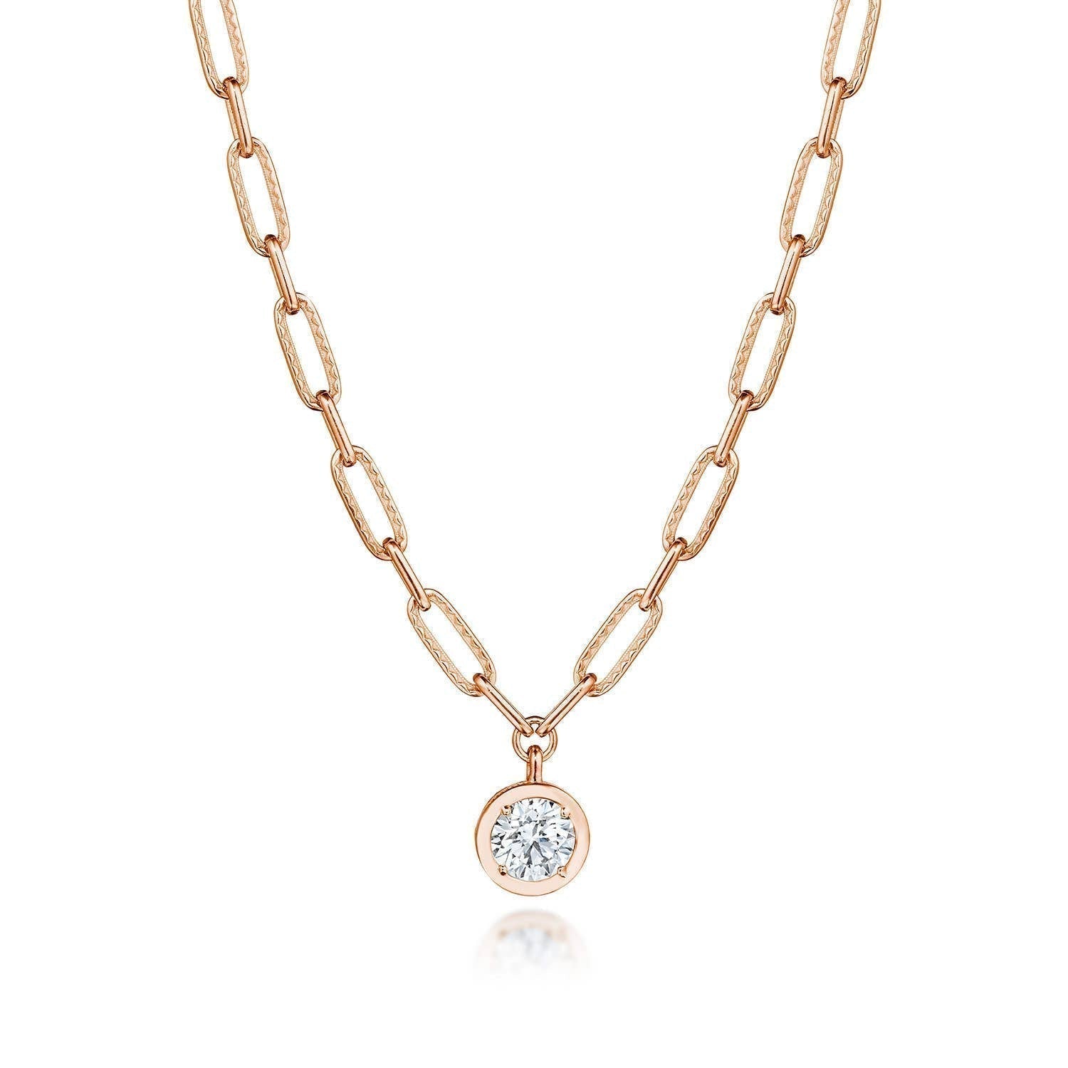 A bezel pendant of captivating depths. The high polish frame enthralls a lab grown diamond center. On the reverse, hand-hewn milgrain and pinpoint mined diamonds add dimension. On the chain, Crescent-embellished links alternate with petite links.