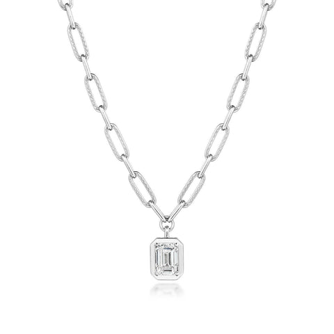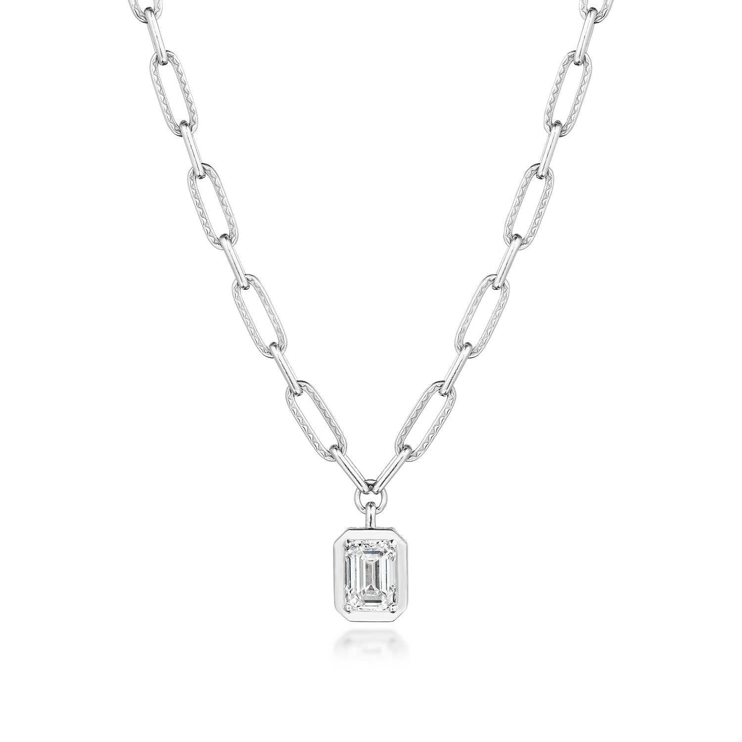A bezel pendant of captivating depths. The high polish frame enthralls a lab grown diamond center. On the reverse, hand-hewn milgrain and pinpoint mined diamonds add dimension. On the chain, Crescent-embellished links alternate with petite links.