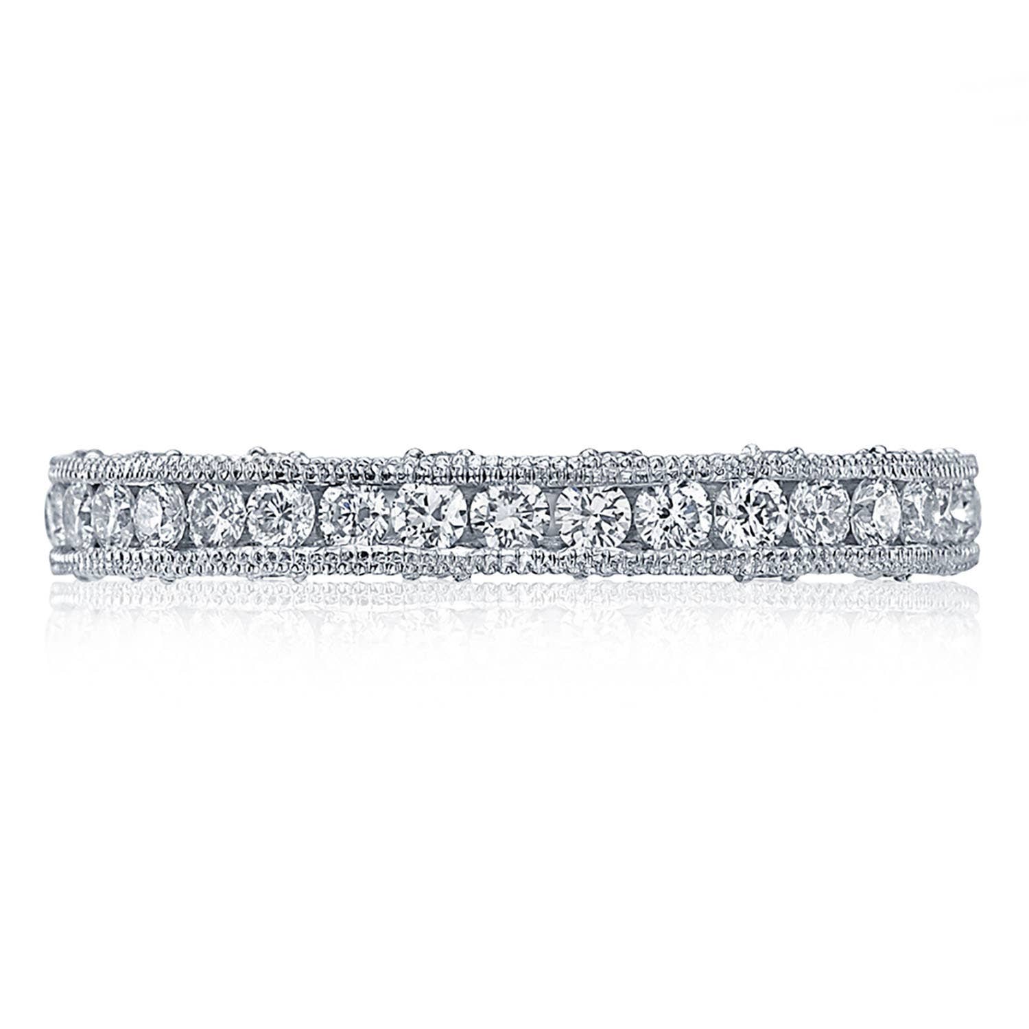 A Tacori best seller! Grace and strength unite in this stunning star selection. Strings of channel set graduated diamonds lead up the ceiling of the band, giving this modern-classic design a pretty profile. Lace-like signature Tacori crescent silhouettes create windows of light along the sides for interest from every angle.