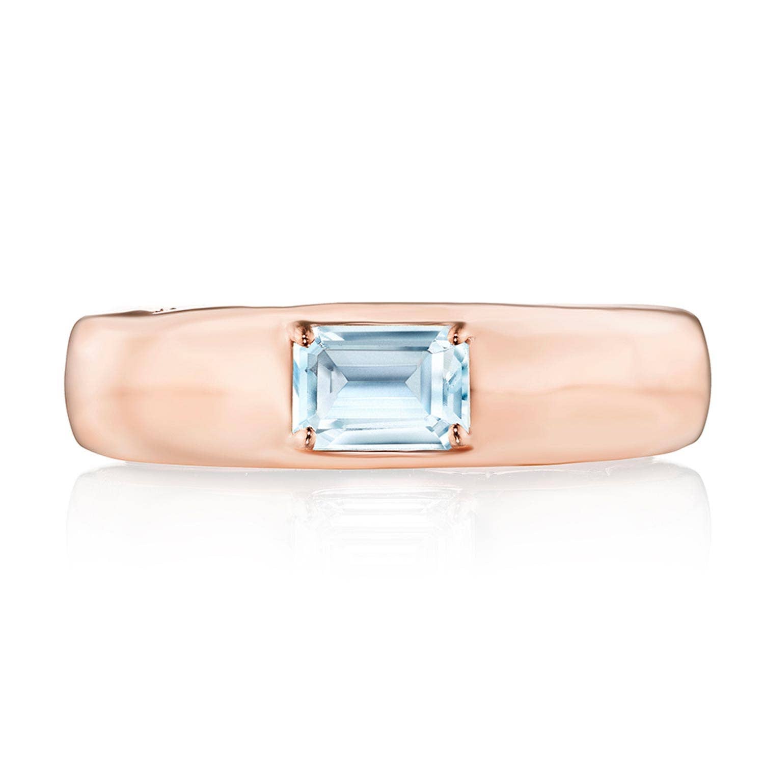 Solid 18k gold is expertly crafted into a sleek, domed ring that enthralls a Sky Blue Topaz gemstone. The high polish finish lends a striking and alluring contrast to the bezel-inspired piece, while a hidden TACORI Crescent adds dimension.