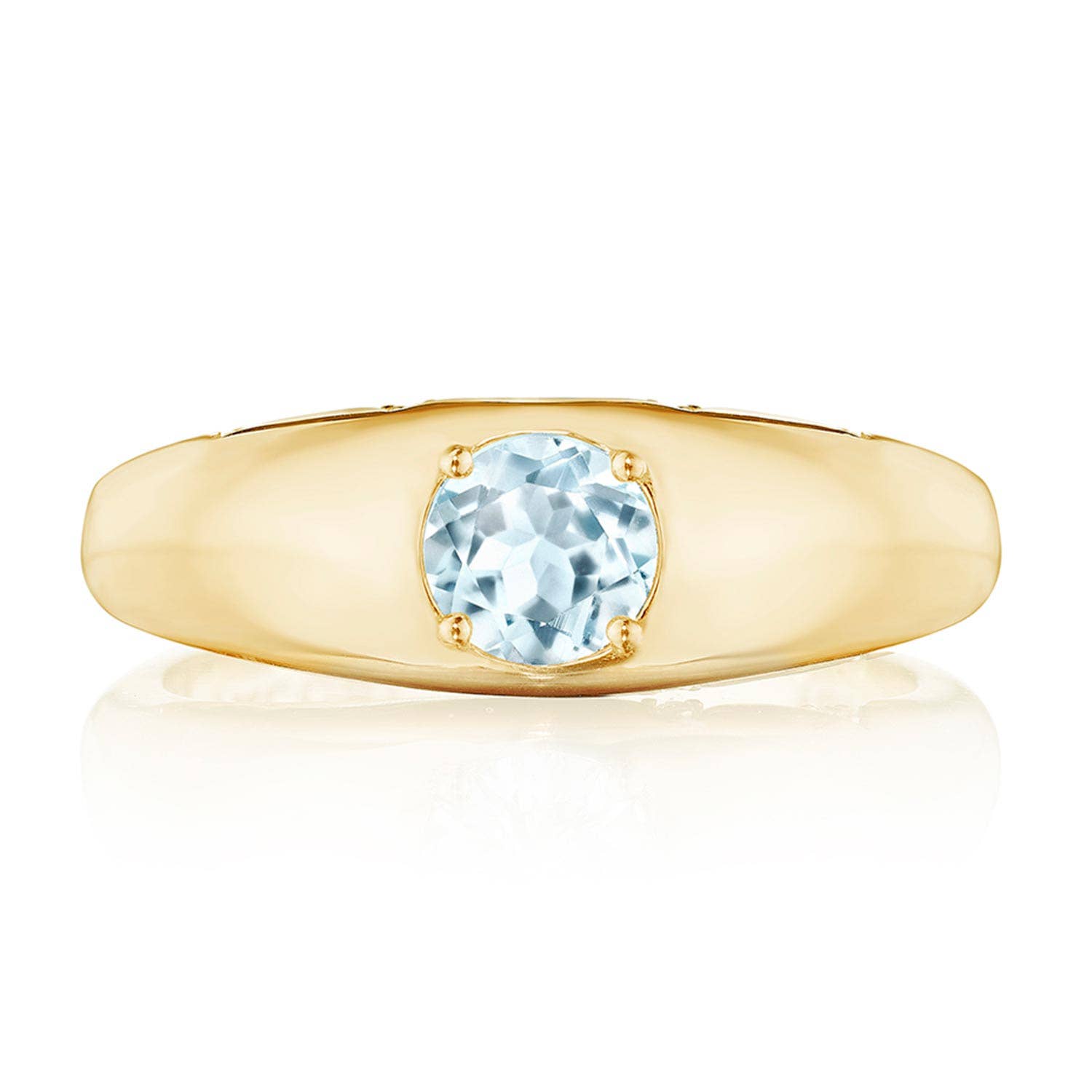 Solid 18k gold is expertly crafted into a sleek, domed ring that enthralls a Sky Blue Topaz gemstone. The high polish finish lends a striking and alluring contrast to the bezel-inspired piece, while a hidden TACORI Crescent adds dimension.