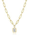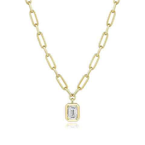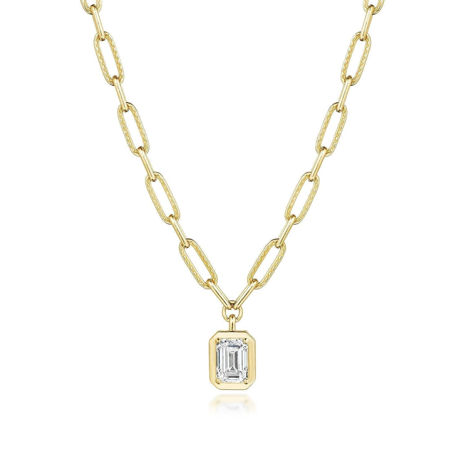 A bezel pendant of captivating depths. The high polish frame enthralls a lab grown diamond center. On the reverse, hand-hewn milgrain and pinpoint mined diamonds add dimension. On the chain, Crescent-embellished links alternate with petite links.