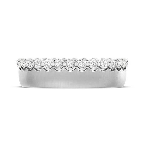 Prong-secured round brilliant diamonds encircle the upper perimeter of the wedding band, with each stone countoured with meticulous engraving. Crescents embellish the inner face silhouette. Rings are available in sizes 4-12.