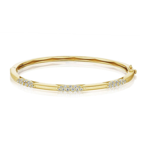 Three diamond-studded crescent-shaped ellipses add meticulous and eye-catching detail to this delicate - yet bold - bangle of 18kt gold.