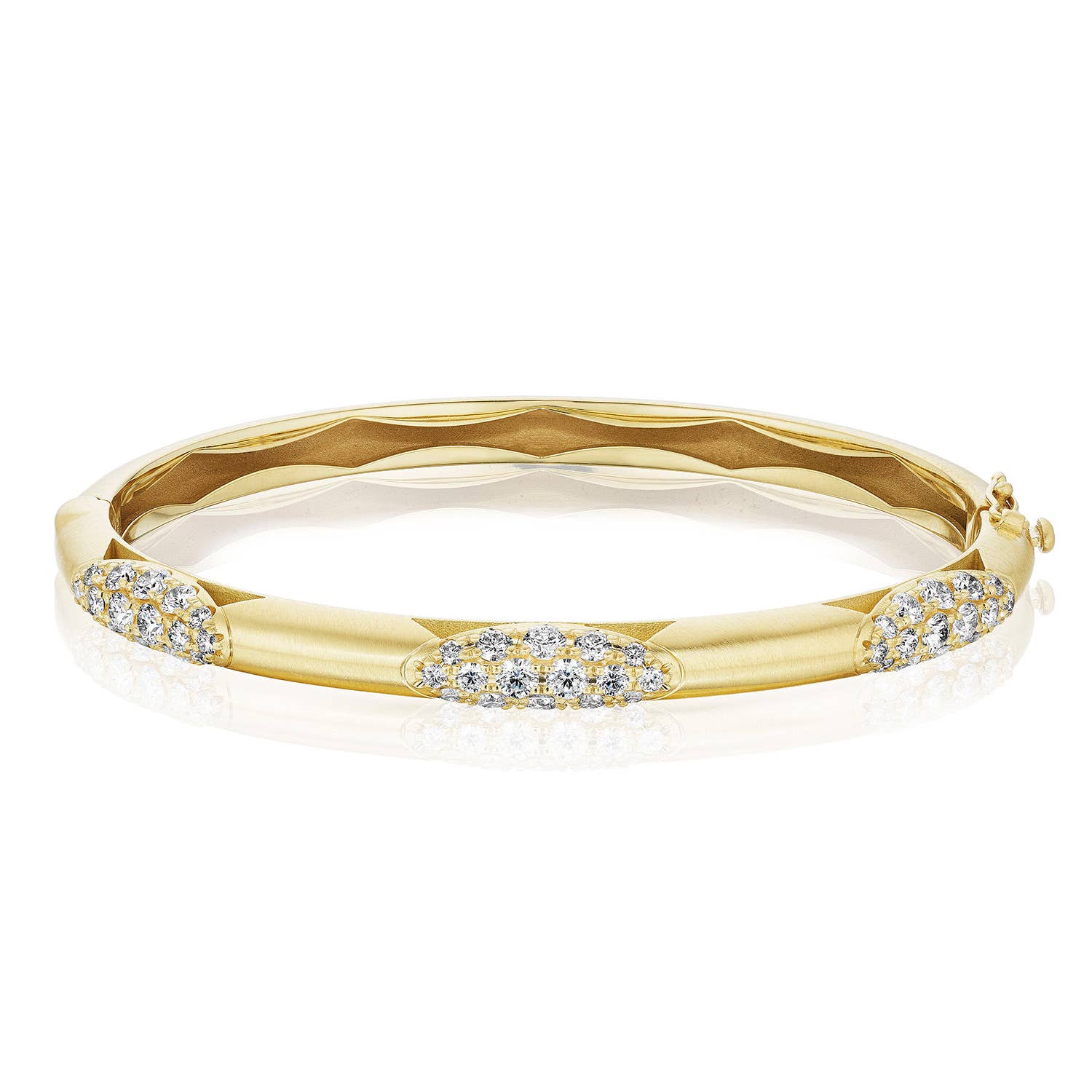 Three diamond-studded crescent-shaped ellipses add meticulous and eye-catching detail to this delicate - yet bold - bangle of 18kt gold.