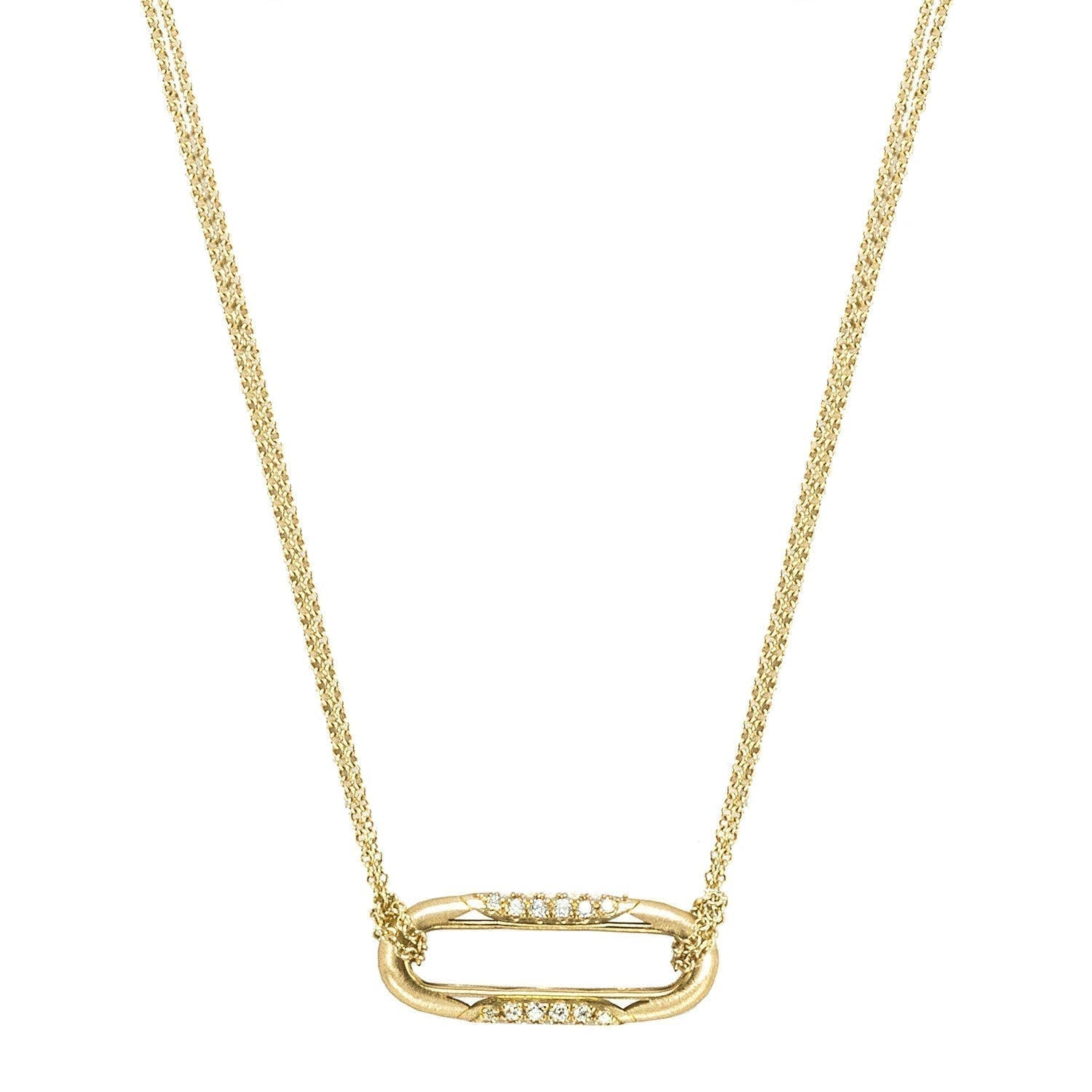 An 18kt gold link is meticulously hand set with an ellipse of sparkling round-brilliant diamonds. The link hangs horizontally from a delicate double-cable chain, displaying truly TACORI details in a bold and contemporary silhouette.