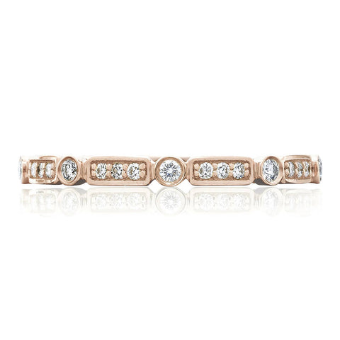 For the bold Tacori Girl, looking for a wedding band to show off your unique style. Bezel set brilliant round diamonds are enveloped in circular and rectangular baskets for a modern band that you'll never want to take off.